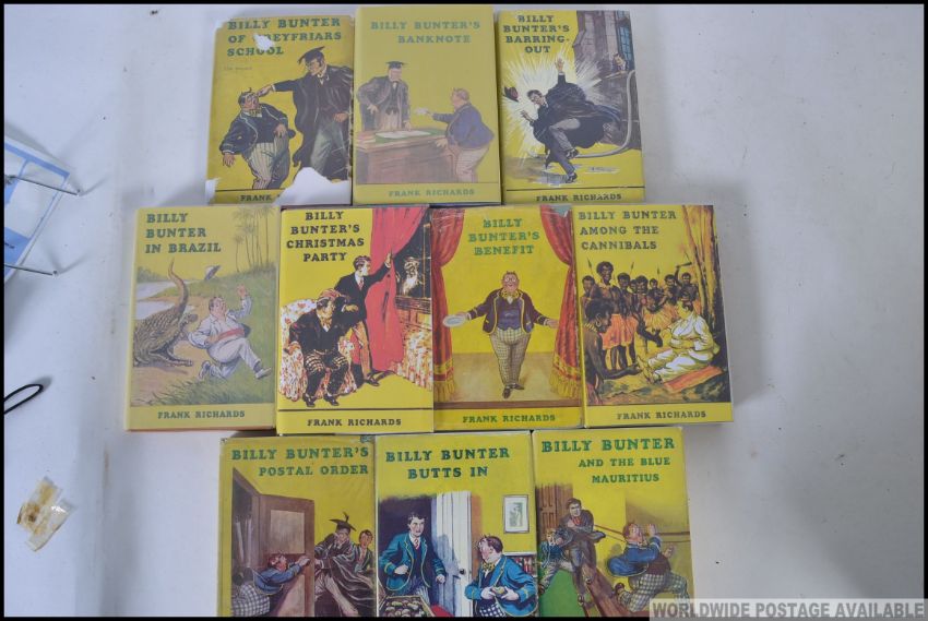 BILLY BUNTER COMPLETE COLLECTION; A complete set of 1-38 original ' Billy Bunter ' books by Frank Richards. Mostly first editions, with some second editions. All dates from 1947 - 1965. Titles, in order, comprising of; Of Grayfriars School, Banknote, Barring Out, In Brazil, Christmas Party, Benefit, Among The Cannibals, Postal Order, Butts In, And The Blue Mauritius, Beanfeast, Brainwave, First Case, The Bold, Does His Best, Double, Backing Up, Lord Billy Bunter, The Banishing Of, Bolt, Afloat, Bargain, The Hiker, Out OF BOunds, Comes For Christmas, The Bad Lad, Keeps It Dark, Treasure Hunt, At Butlins, The Ventriloquist, The Caravanner, Bodyguard, Big Chief, Just Like, The Stowaway, Thanks To, Sportsman and Bunter's Last Fling. A good collection.