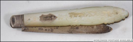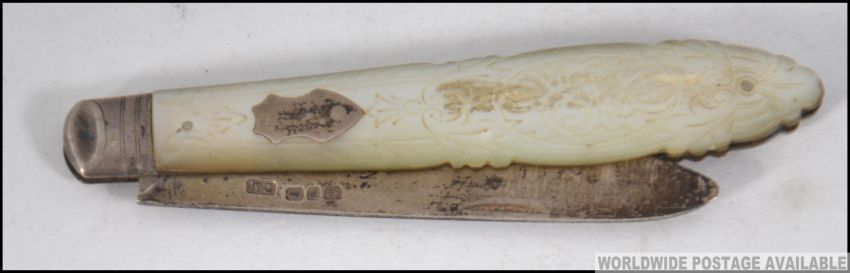 A silver hallmarked fruit knife with mother of pearl handle by Thomas Marples, Birmingham 1889. Together with another. Measures: 9cms long. Total Weight 45.5g