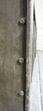 A pair of Industrial believed ex military 1940's 44 section cubby stationary pigeon hole cabinet in British military green paintwork with remains of paperwork notation to front.The pigeon holes measure (in cm) 44 tall, 129 wide and 23 deep. Each weighs 33kg. Each pigeon hole measures 10.5cm wide x 6.5cm tall at the opening, however there is a lip and the internal height is larger (still too small for an actual pigeon though).
