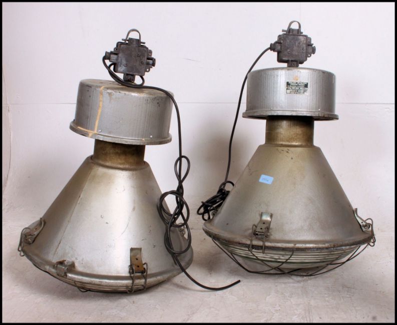 A pair of vintage mid century Zaklady Metalow Industrial large factory pendant lights complete with the glass shades and cages with original manufacturers plaques atop to the bracket fixtures