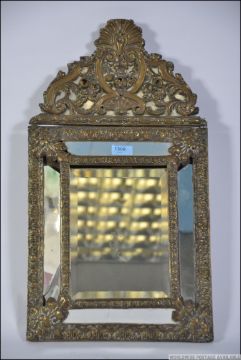A Victorian brass rococo repousse bevelled edge wall mirror of Venetian form with acanthus leaf crest. 58cms high x 34cms wide