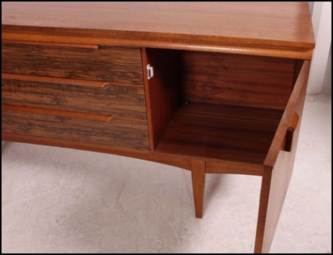 A 1960's Danish influence teak wood sideboard raised on tapering supports having a wide and low body with a series of cupboards and a bank of drawers. Measures(cm) Height 76 x Width 172 x Depth 45.