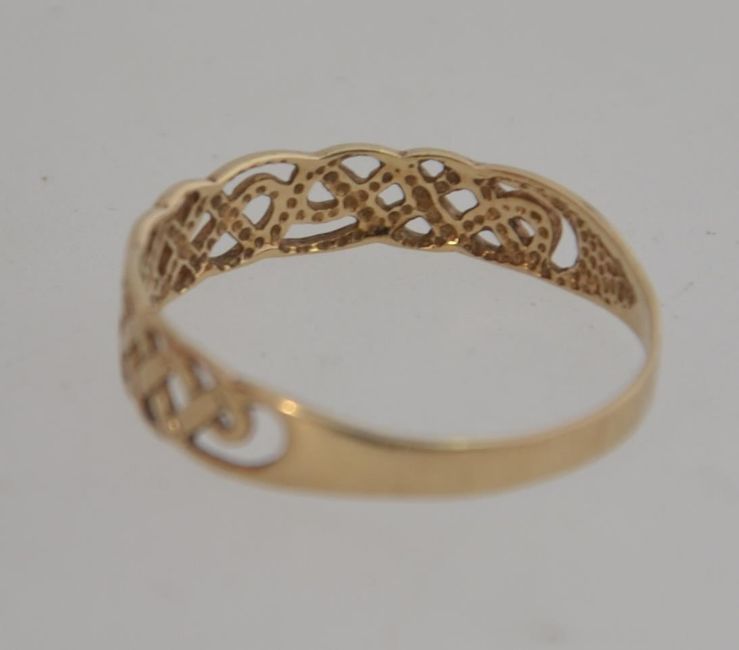 A hallmarked 9ct gold ring with pierced celtic knott motif. Size R. Hallmarked Birmingham.