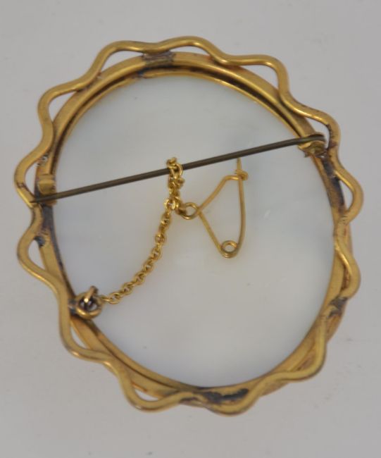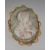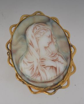 A large 19th century cameo brooch with gold plated lattice mount and pin, the central cameo of a veiled maiden. Weight approx 138