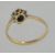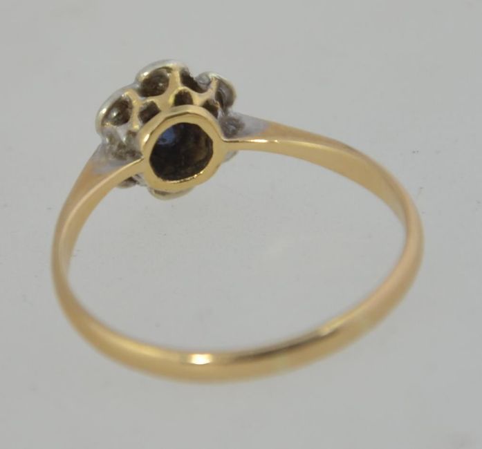 An 18ct gold, sapphire and diamond flower head ring. The 7pnt sapphire surrounded by 1pnt diamonds. Total weight 1.7g / Size M.5