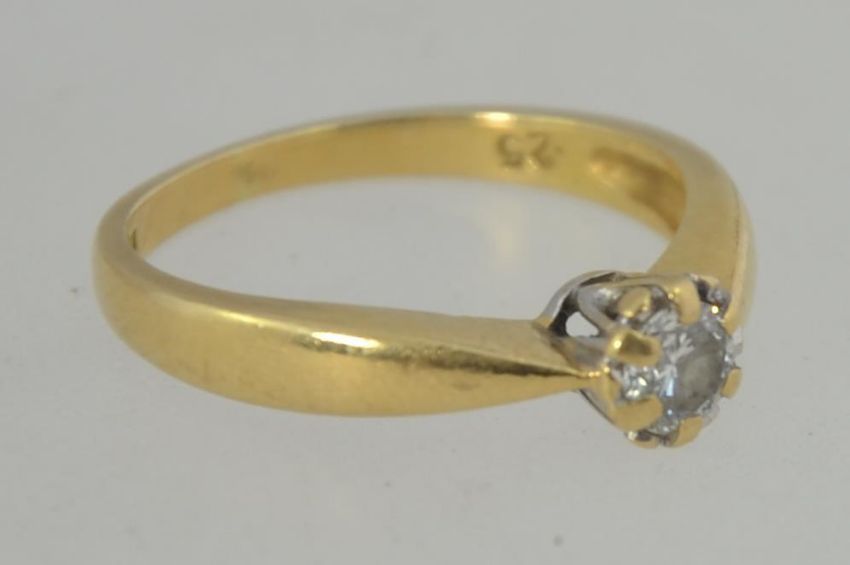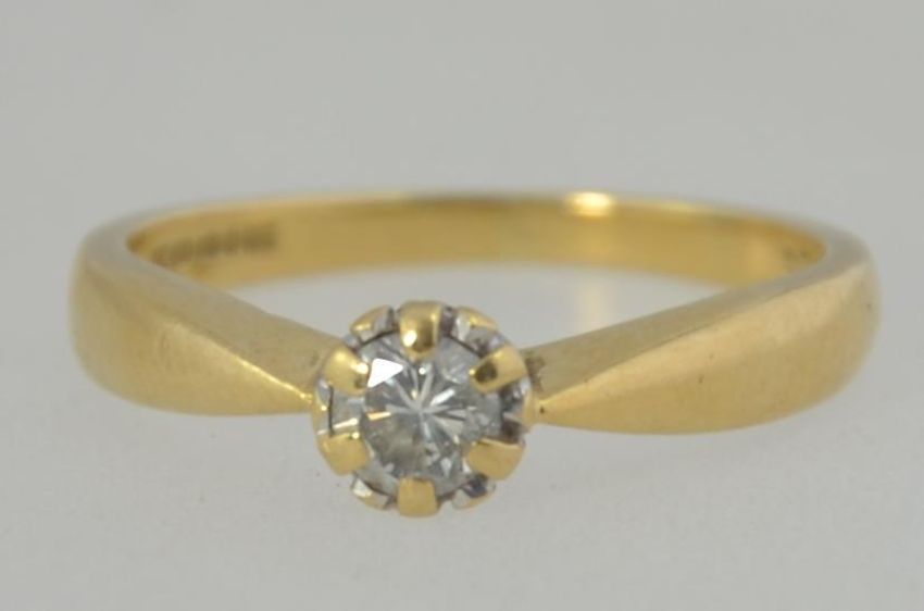 A 9ct gold and diamond single stone ladies ring. Hallmarked to the shank with a 25pnt single claw mounted stone. Weight 2.8g / Size k