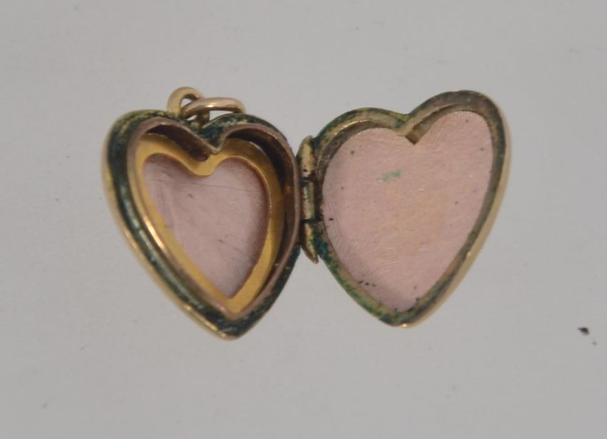 9ct gold front and back heart shape locked with chase decoration and round bale atop. Marked to verso. Total weight 1.8g / 1.2cms high