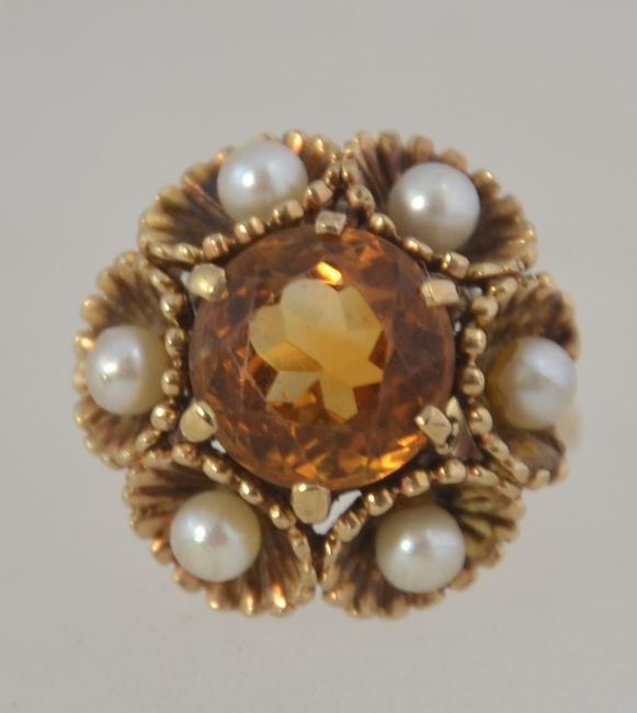 A 9ct gold Art Deco dress ring with central round cut citrine surrounded by scalloped set pearls in a cluster setting. Marked 9ct, tests 9ct gold, Size I.5. Weight 7.7g