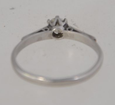 A ladies vintage platinum and diamond single stone ring. The single stone being claw mounted 20pnt diamond. SIze M Weight 2.6g