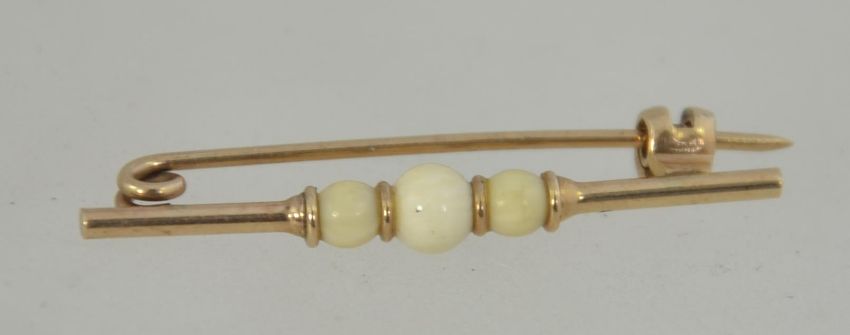 A early 20th century 9ct gold bar brooch with ivory ball styling with clip c clasp. Measures 3.3cms. Marked 9ct tests 9ct gold.