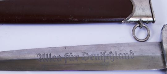 GERMAN SA DAGGER: A German Third Reich SA dagger, the 22cm double edged blade etched "Alles fur Deutschland" (All for Germany) with makers mark for CD Schaff (RZM M7/56, the stained wooden handle with SA runes and Nazi emblem below. With scabbard. 35cm long