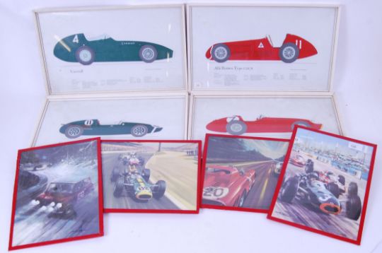 MOTOR RACING: A set of 4 framed glazed 1960's motor racing interest prints. To include Alfa Romeo Type 158 / 9, Vanwall, Maserati 250F, Cooper 2.2 Litre. Also 4 Michael Turner framed prints of motor racing interest to include rally, formula 1, Le Mans etc