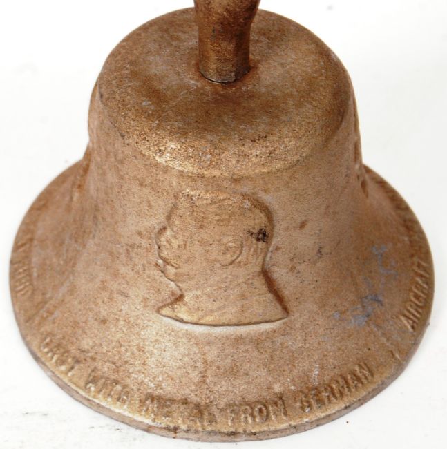 VICTORY BELL: A ROYAL AIR FORCE 'VICTORY' BENEVOLENT FUND BELL inscribed 'Cast in metal from German aircraft shot down over Britain 1939-45', bearing the profile images of Churchill, Roosevelt and Stalin, 16cm high approx.