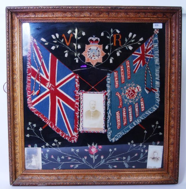 VICTORIAN REGIMENTAL PANEL: A good Victorian antique Regimental Panel, relating to one serving member of the 11th Regiment Of Foot, Devonshire Regiment. Entirely hand stitched detailing with wool. Detailing the battle honours and flags of the regiment, the infantry man's photograph to centre and photos of wife and child to the lower corners. Framed and glazed. Likely of Crimea interest.