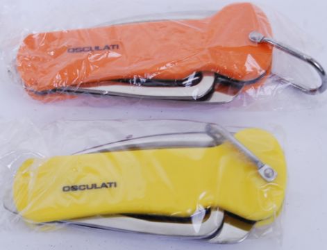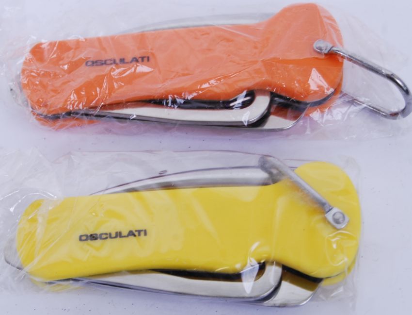 OSCULATI: A collection of 10x new and unused Osculati fishing / sailing knives. 7x orange, 3x yellow. All new, in original boxes. Stainless steel, with a plastic cover and sharp serrated knife, a marlin spike, and a shackle key.
