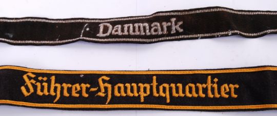 CUFF TITLES: Two WWII related Third Reich Nazi cuff titles - the first being for Danmark, the other a Fuhrer Hauptquartier.