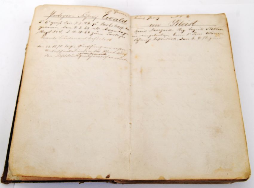 RARE & IMPORTANT 19TH CENTURY PRUSSIAN WAR DIARY & REGISTER; An incredible c1870 Prussian War Imperial German Cavalry register for the 1st Pomeranian Lancers, 4th Regiment, 2nd Squadron. Belonging to a 'Quartiermeister' August Friedrich Wilhelm Lemke. The Register details all those serving in the regiment including names, and details such as hair colour, build and height etc. All handwritten by Lemke. To the first pages are the 'rules' for the book, also hand written. Also from the same collection; a fascinating Diary, also by Lemke, detailing day to day life during the period from Jul 1870 - May 1871. Details of marches, exercises, battles, injuries, movement of troops and even a list of horses names can be found within. Both books handwritten in 19th century German. Provenance through descent - the vendor has transposed the entries into typed text for ease of reading. A fascinating and incredibly rare insight into this period of history.