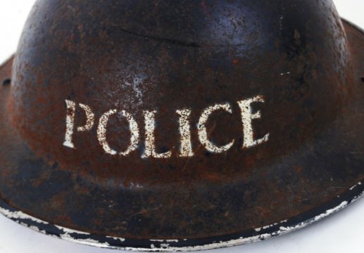 POLICE HELMET: A WWII Second World War era British Police tin helmet, with white notation to front and original leather liner.