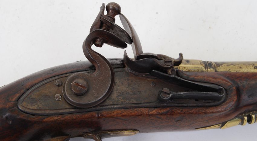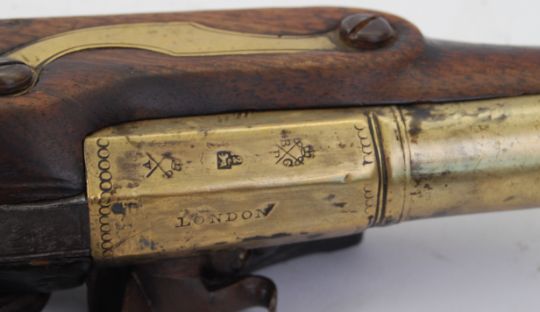 19TH CENTURY PISTOL: A good 19th century brass bell mouthed cannon barrelled flintlock pistol, the lockplate marked H. Nock. Proof marks to brass barrel. Marked ' London.' Brass furniture including the escutcheon plate. 25cm long.