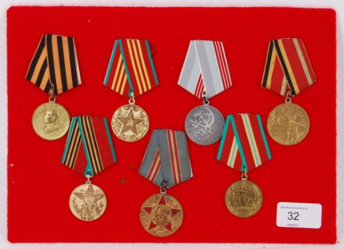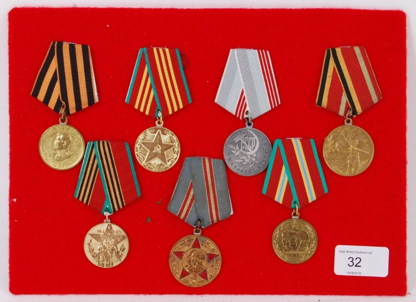 MEDALS: A collection of assorted Russian and related commemorative medals, all mounted on a red display board. To include WWI, WWII, Victory Over Germany, Impeccable Service, Veterans Of Labour etc