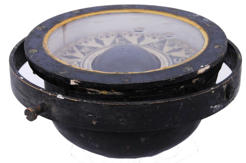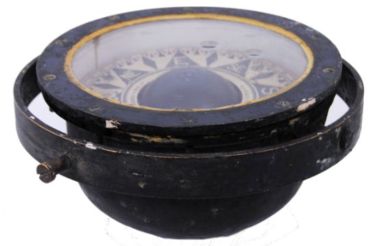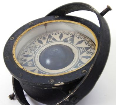 COMPASS: An early 20th century / late 19th century gimball ships compass made by Henry Hughes & Sons. Glazed front, with gimball movement and original mounting ring. 20cm diameter.