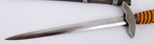 LUFTWAFFE DAGGER: An original WWII Second World War Luftwaffe Gustav Spitzer pattern dagger. The blade unmarked. With original metal scabbard.