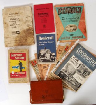 AUTOMOBILIA: A collection of assorted vintage automobilia publications to include Ford Anglia Saloon parts list, various antique ' Locomotive ' magazines, Police Drivers manual, Fordson Tractor Manual and a Renault Dauphine Service Manual etc.
