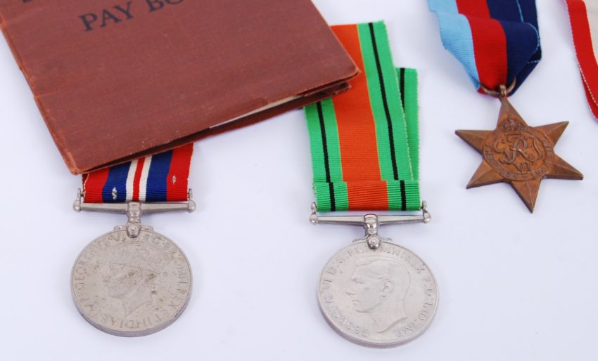 WWII MEDAL GROUP: A Second World War WWII medal group of five including the Africa and Italy Stars, along with the original recipient's Soldiers Service & Pay Book. Awarded to 100787 Private WH Wakeford of the Royal Army Service Corps. His service record details him as once being a Prisoner Of War.