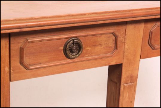 A Regency style blond walnut console / hall table being raised on turned and tapering legs with a series of drawers to the breakfront top. Measure: 87cms high x 127cms wide x 40cms deep.