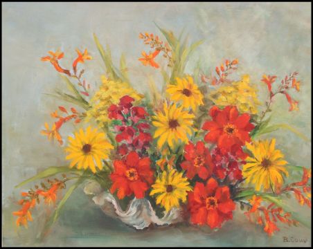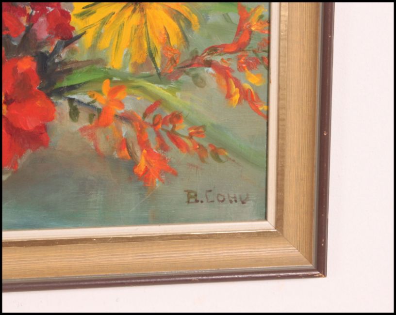 B.Cohu. A 20th century retro still life oil on canvas painting of a basket of flowers being signed to the corner. Framed.
