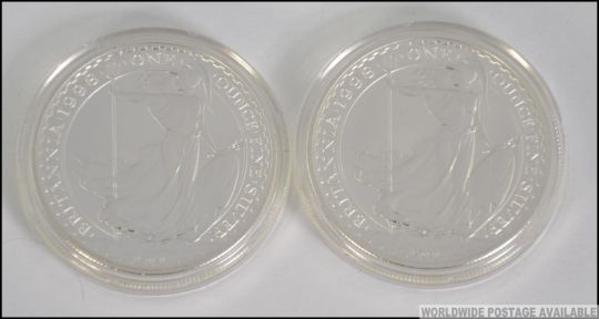 2 silver £2 proof coins in the cases, both one ounce fine silver, the obv marked for Nathan