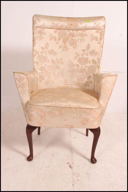 An early 20th century iron framed wingback armchair raised on cabriole legs with thin upright damask upholstered frame . Measures: 97cms high x 66cms wide x 61cms deep.