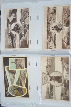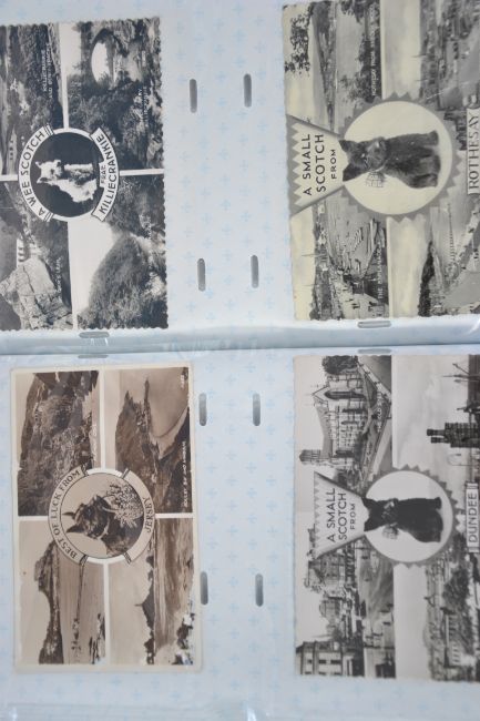 UK Postcards. Two albums of multi topographical views. Album one (250 cards) album two: later with various Scottish dogs (120 cards)
