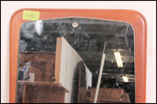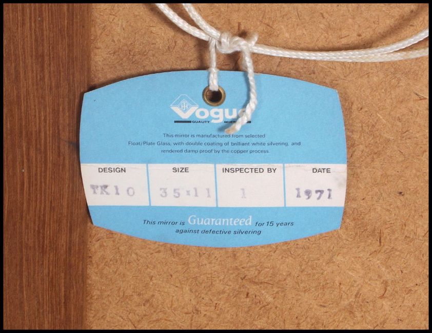 A retro 1970's atomic teak and frameless wall mirror. The teak chamfered edge panel to verso with original makers lable attached for Vogue