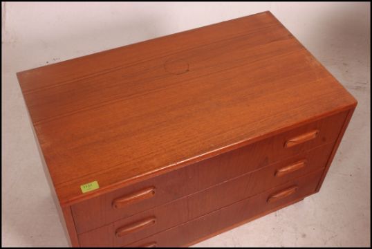 A retro 20th century teak Danish style chest of drawers. Inset plinth base with twin drawers above. Measures 54cms x 81cms x 46cms