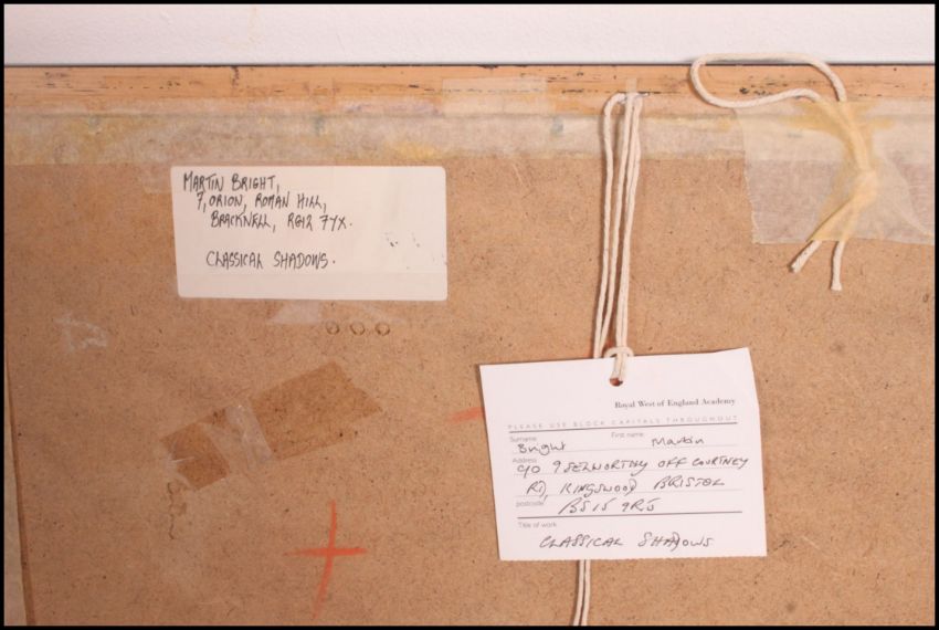 A framed and glazed contemporary watercolour painting by Martin Bright of The Royal West Of England Academy entitled Classical shadows. 62cms high x 45cms wide.