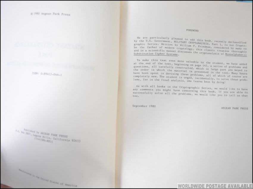 Cryptographic Series; a collection of 5x cryptographic series books - Military Cryptanalysis, Riverbank Publications, 1-3.
