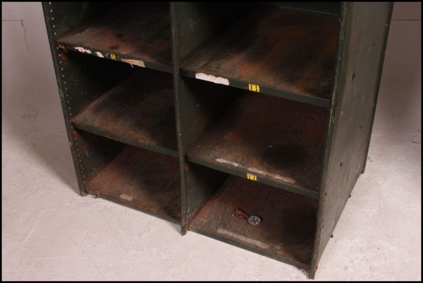 A large Industrial believed ex military 1940's 12 section cubby stationary pigeon hole cabinet in British military green paintwork