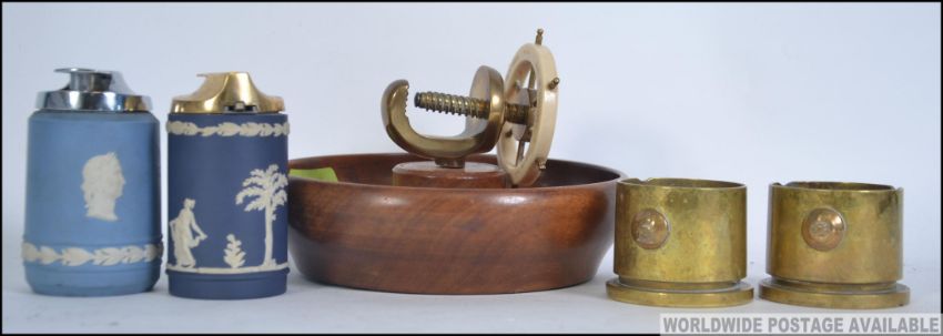 A collection of table items to include two Wedgwood table lighters, a nautical inspired nut cracker and a pair of trench art ashtrays.