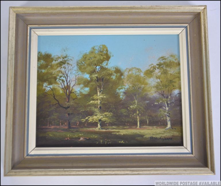 George Horne (1900-) An oil on board painting of a woodland scene entitled ' Spring in the Forest ' Hampshire, possible the New Forest. Signed to the corner and framed. Measures 18cms high x 23.5cms wide ( picture )