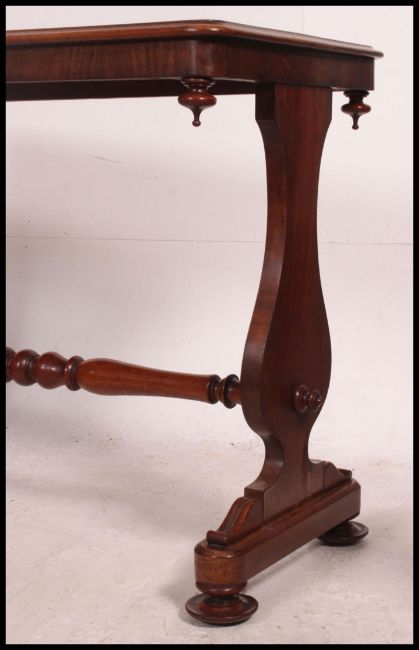 A 19th century Regency mahogany writing table raised on lyre shaped supports with pad feet united by turned stretcher. Above a rectangular table top. 74cm high, 100cm wide, 51cm deep