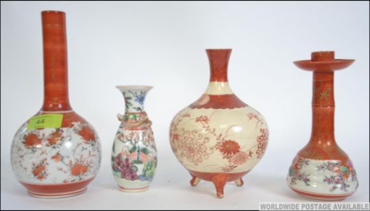 A collection of 19th century Japanese Satsuma ware ceramics to include candlestick vase, solifleur vase and bulbous 3 legged case. Together with a Chinese small famille rose vase. Measures: 22cms high.