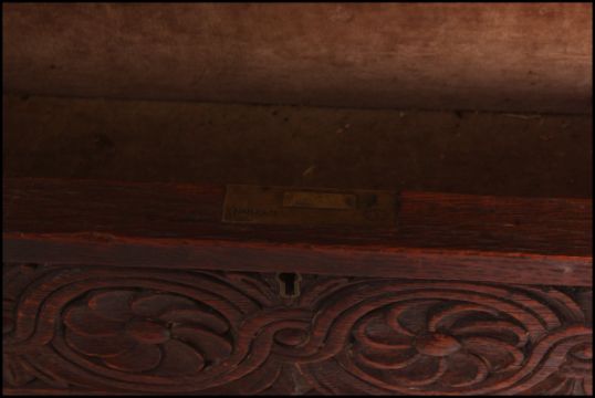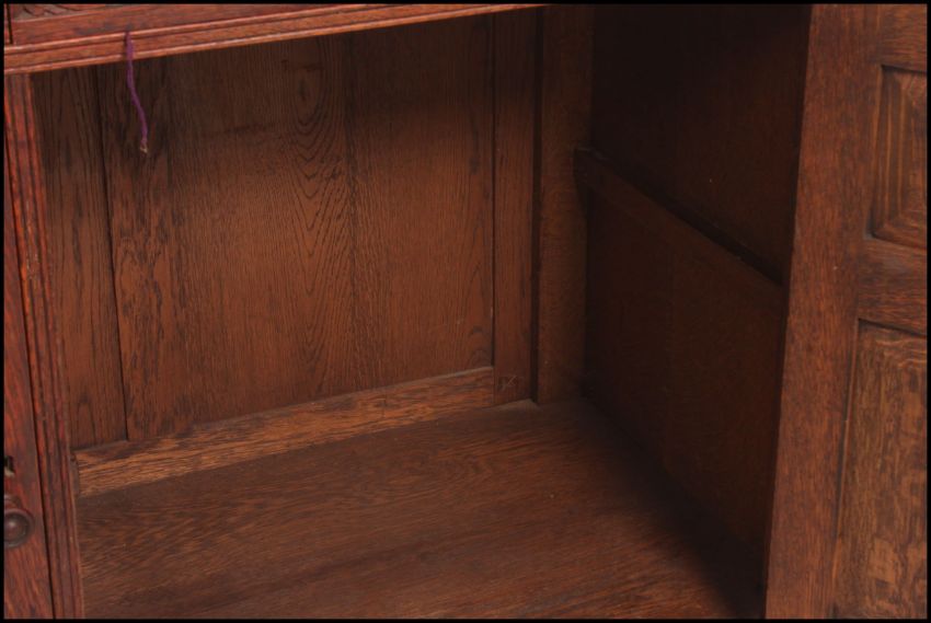 A Victorian Maple & Co carved oak court cupboard sideboard. The solid oak cupboard with twin doors under 2 short drawers with gallery upright top having cabinet flanked by carved columns. Black maple and co label to the drawer