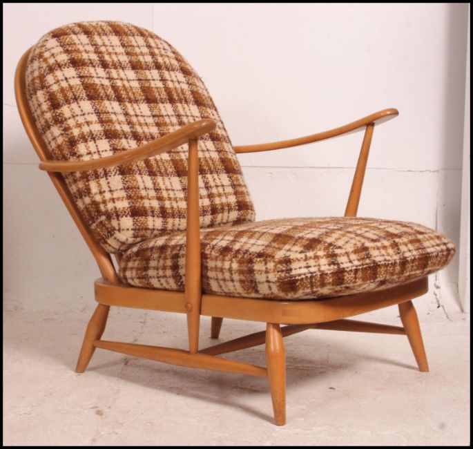 A Ercol Windsor pattern 1970's armchair and ottoman footstool in beech and elm. The armchair and footrest retaining the original wool upholstered cushions. Matching three seat sofa settee in lot. Measure: 77cms high x 90cms wide x 65cms deep.