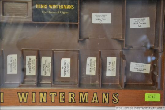 A vintage Henri Wintermans cigar shop display cabinet having glass door with sectional interior within