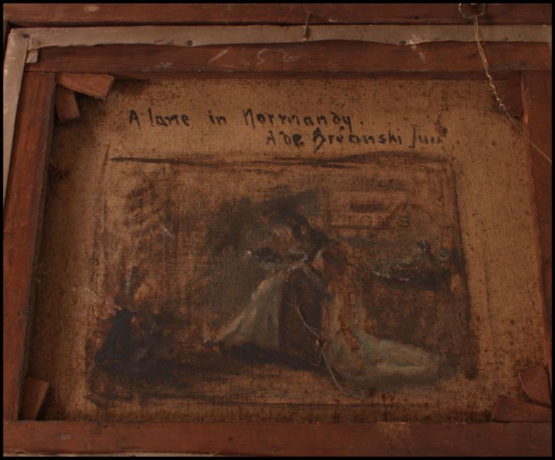 Alfred De Breanski (1852-1928) England. ' A Lane in Normandy ' Oil on canvas painting signed to the lower corner with further notation to verso. Set within gilt frame. 31cms wide x 39cms High ( painting)