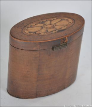 A George III satinwood and marquetry tea caddy, of oval form having marquetry inlay decoration with a hinged lid having central lozenge marquetry inlay. Measures: 13cms high.