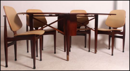 A 1950's teak wood drop leaf dining table together with a set of matching dining chairs upholstered in the original cream faux leather. Chairs measure 80cms high x 48cms wide x 42cms depth / table 71cms high x 88cms wide x 30cms depth