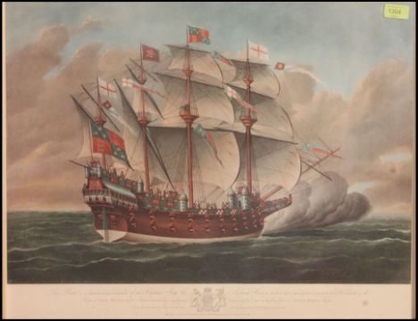 A 20th century framed print of ' Great Harry ' warship. Copy of an 18th century engraving. Framed and glazed