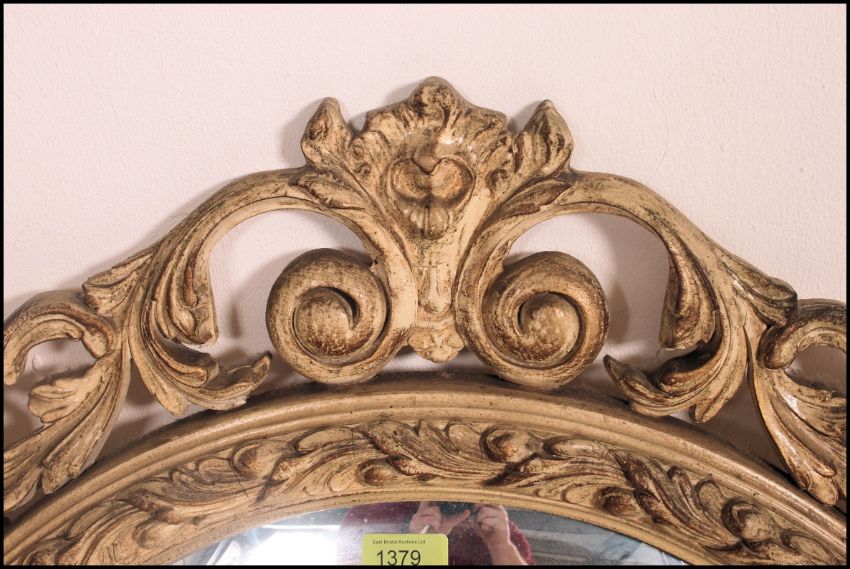 A good large mid century pair of circular convex fish eye mirrors set within resin painted rococo lattice worked frames.